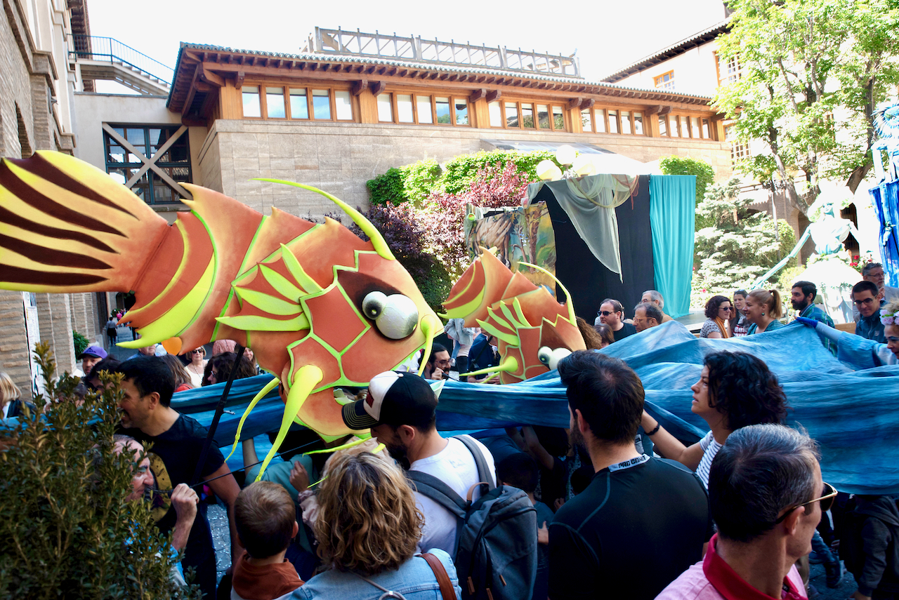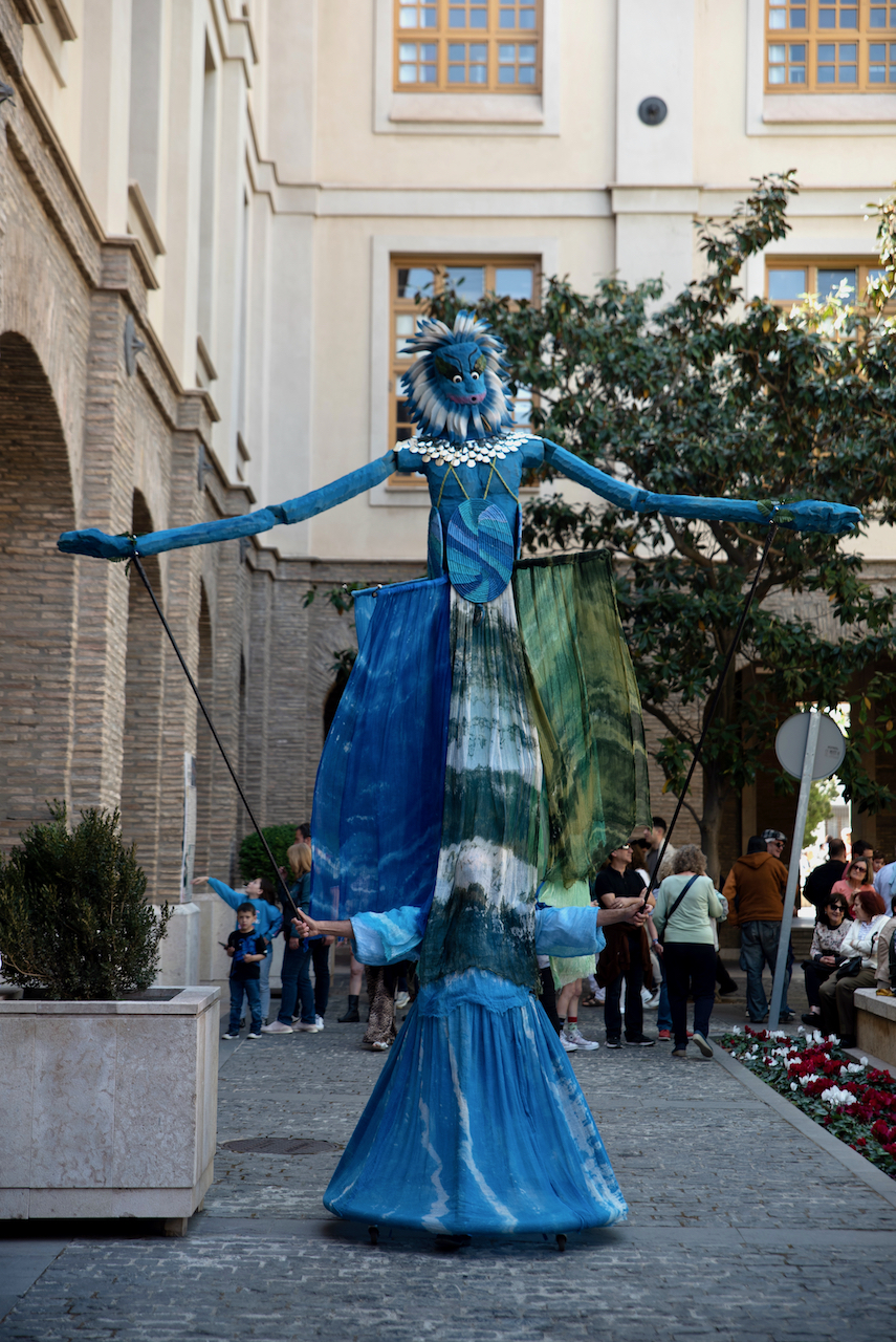 Como un titán de airosa cabellera, como un gigante que desplaza fluido, toma forma humana, rodeado por las aguas de múltiples formas que danzan y giran a su alrededor. Chiquitas y grandes, repletas de peces saltarines, Ebro joven baila con ellas.